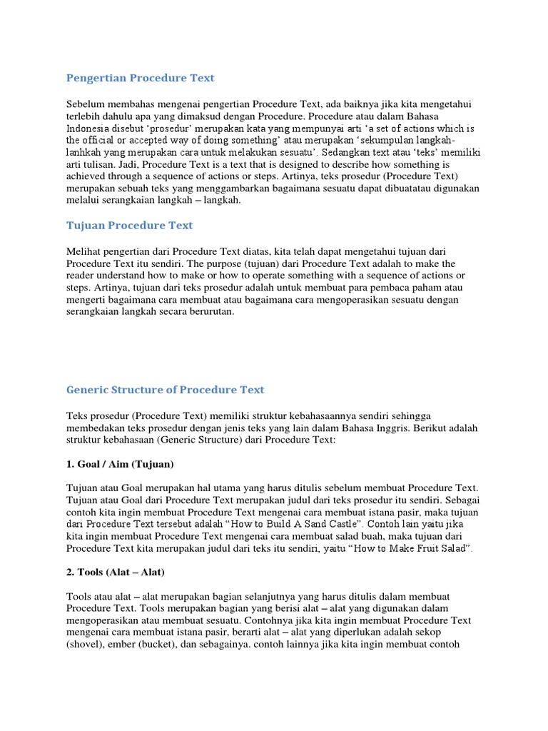 Itulah kumpulan contoh teks prosedur terlengkap dan terbanyak, dari mulai teks prosedur sederhana hingga teks prosedur membuat makanan dan minuman. Salah satu contohnya adalah teks prosedur. Used goods don't always have to be thrown away immediately when not in use. Contoh teks prosedur bahasa inggris. Dibawah ini akan memberikan beberapa contoh dari descriptive text di dalam bahasa inggris seperti tentang hewan, benda, teman, tempat, ibu, kucing, artis, orang, boneka, dan juga ayah.