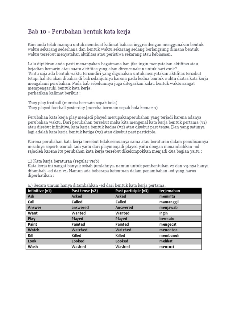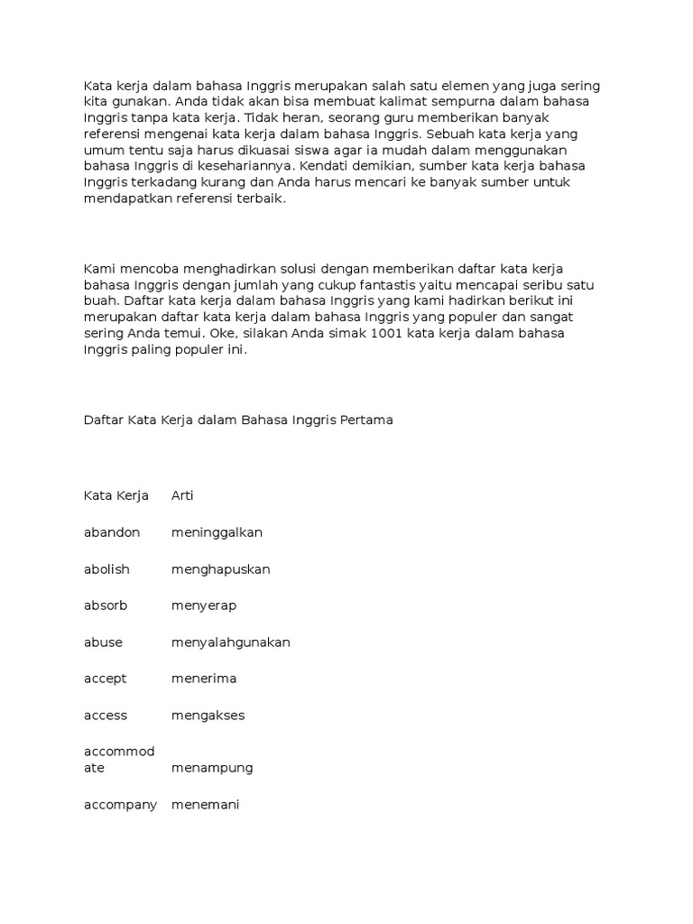 Seperti banyak hal lainnya dalam bahasa inggris, ini tergantung pada konteksnya. Ini merujuk pada bentuk kalimat yang digunakan dalam percakapan. Bahkan pada saat memperkenalkan diri pertama sekianlah pembahasan mengenai 10 kata kerja dalam bahasa inggris dan semoga saja artikel ini dapat menambah wawasan anda, selamat belajar. Keduanya juga memiliki bentuk pertama, kedua, dan ketiga yang perlu dihafalkan guna kepentingan pembentukan kalimat pasif dan perubahan bentuk waktu atau tenses. Mengetahui tentang kosakata bahasa inggris kata kerja akan memudahkan kamu dalam mempelajari bahasa inggris kedepannya.